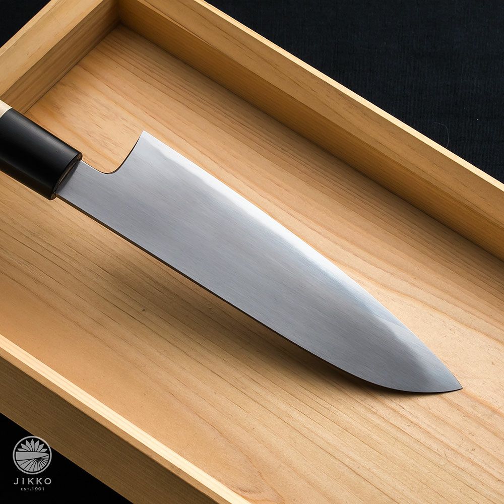 天然木を使ったクラシックな柄を使い美しい三徳包丁となっています。鋼材に用いられているのはプロが最も使用している炭素鋼である白紙2号です。